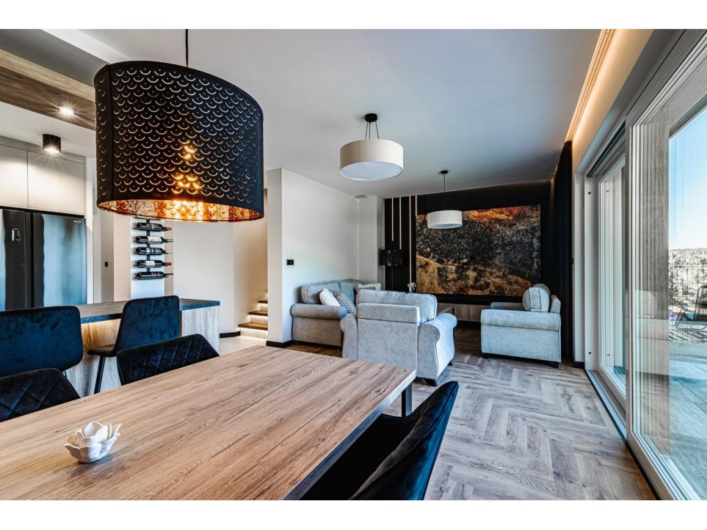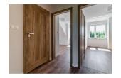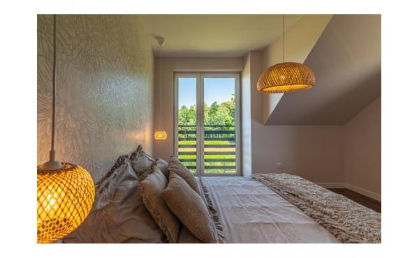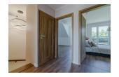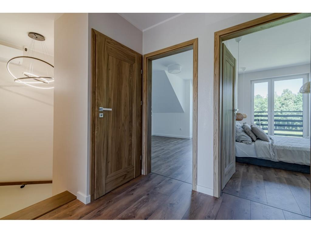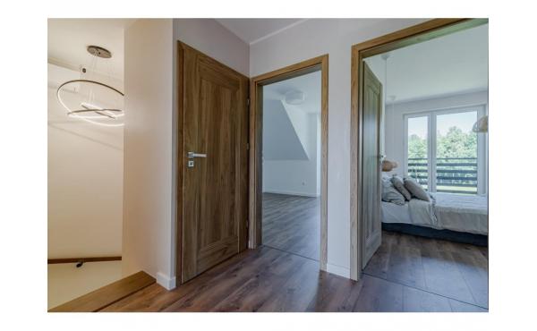 Na parterze znajduje się przestronny salon z jadalnią i otwartą kuchnią, łazienka z prysznicem, duża garderoba z zabudową, pralnia oraz garaż z automatyczną bramą. Z salonu wyjście na zadaszony taras (25 m²) z elektryczną markizą. Na piętrze znajdują się cztery ustawne sypialnie, druga łazienka z wanną i prysznicem oraz pomieszczenie gospodarcze. Dodatkowo dostępne jest ocieplone poddasze (ok. 50 m²) z oknem dachowym.