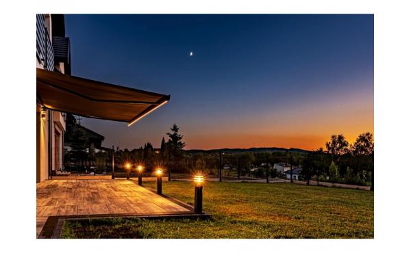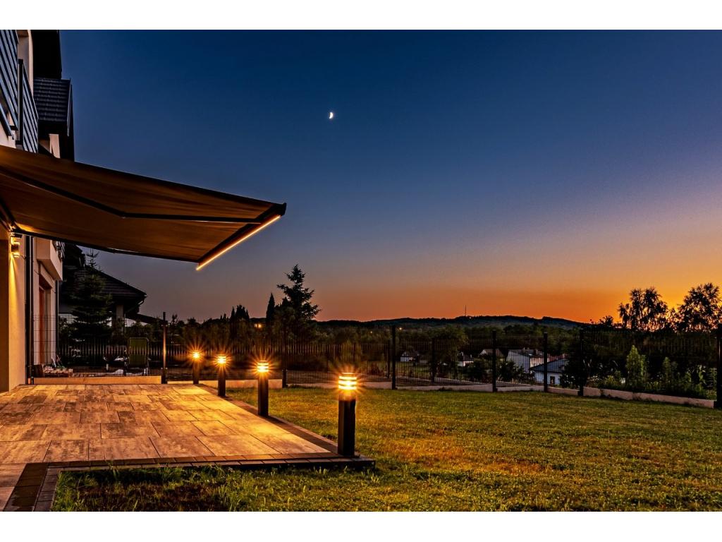Podjazd i taras wykonane z kostki brukowej, automatyczna brama wjazdowa, nowoczesne oświetlenie zewnętrzne, zadbany ogród.