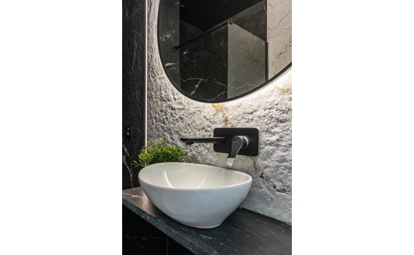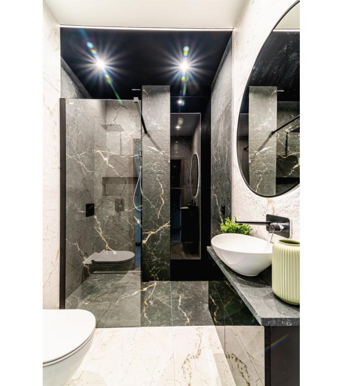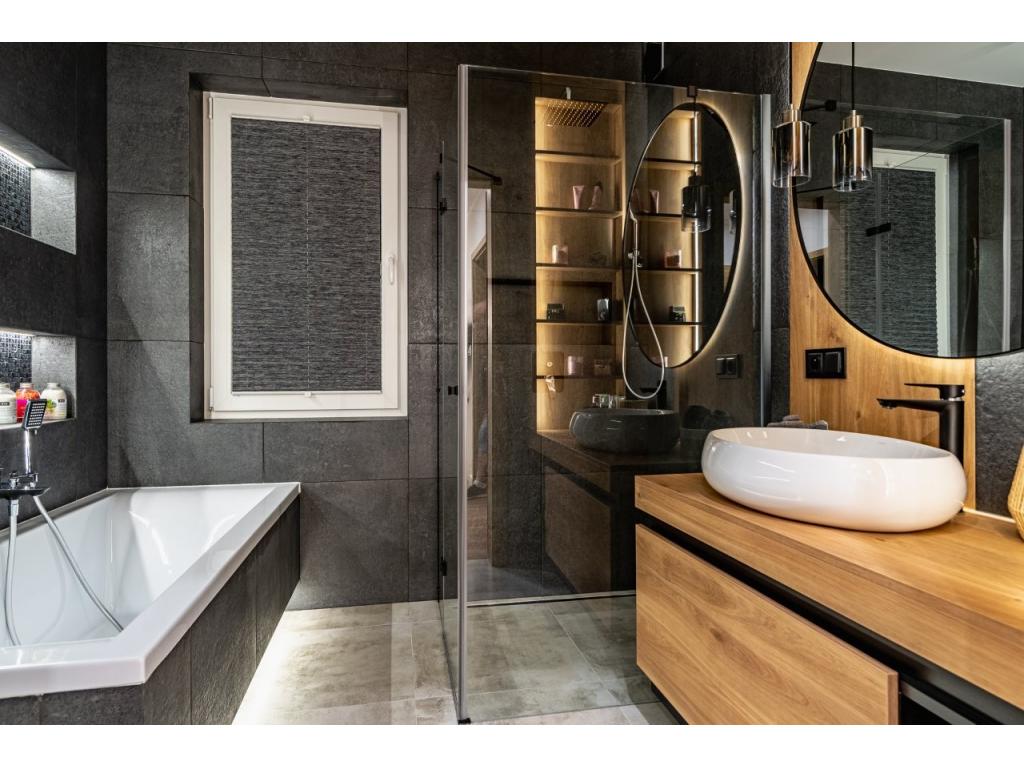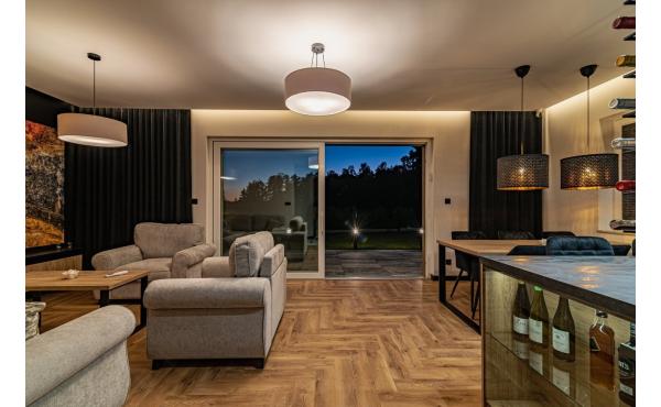 Dom zbudowany z pustaka ceramicznego, bardzo dobrze ocieplony: 20 cm styropianu na elewacji, 30 cm wełny mineralnej na stropie. Ogrzewanie podłogowe na obu poziomach z nowoczesnym kotłem gazowym Bosch, klimatyzacja GREE z funkcją grzania, energooszczędne okna trzyszybowe. Wysoki standard wykończenia – gres wielkoformatowy, panele w jodełkę, zabudowa kuchenna na wymiar z pełnym sprzętem AGD.