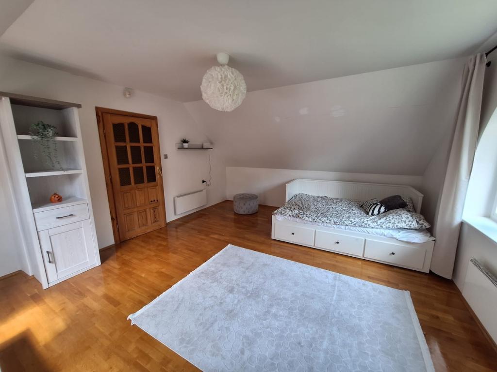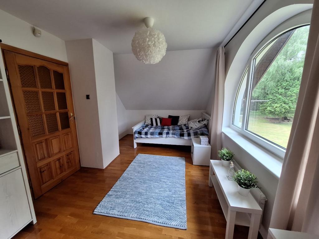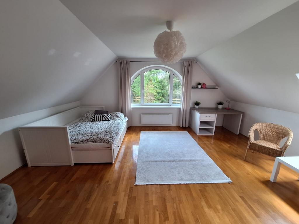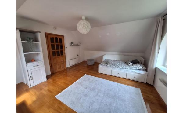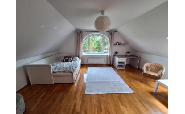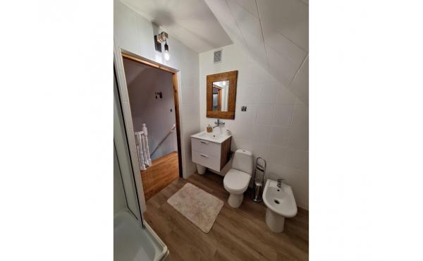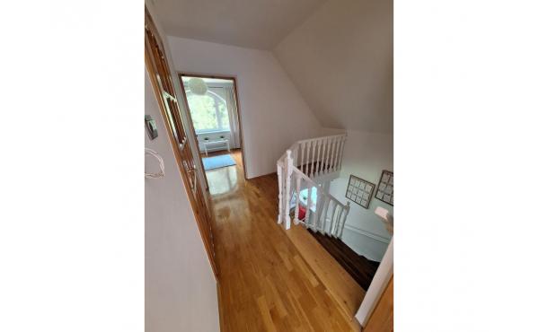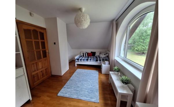 Piętro pełni funkcję prywatną, znajdują się tam dwie osobne sypialnie, łazienka oraz przestrzeń komunikacyjna. Wnętrza urządzone są w spójnym, jasnym stylu, z wykorzystaniem naturalnych materiałów i dodatków, co podkreśla ciepły i przyjazny charakter nieruchomości.