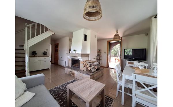 Układ pomieszczeń został zaprojektowany w sposób funkcjonalny i czytelny. Na parterze znajduje się przestronny salon z kominkiem, połączony z jadalnią oraz otwartą kuchnią, co tworzy wygodną i spójną strefę dzienną. Bezpośrednie wyjście na ogród pozwala w pełni korzystać z uroków otaczającej przyrody. Dodatkowo na tym poziomie znajduje się sypialnia, garderoba oraz łazienka.
