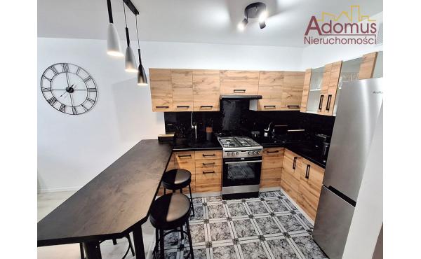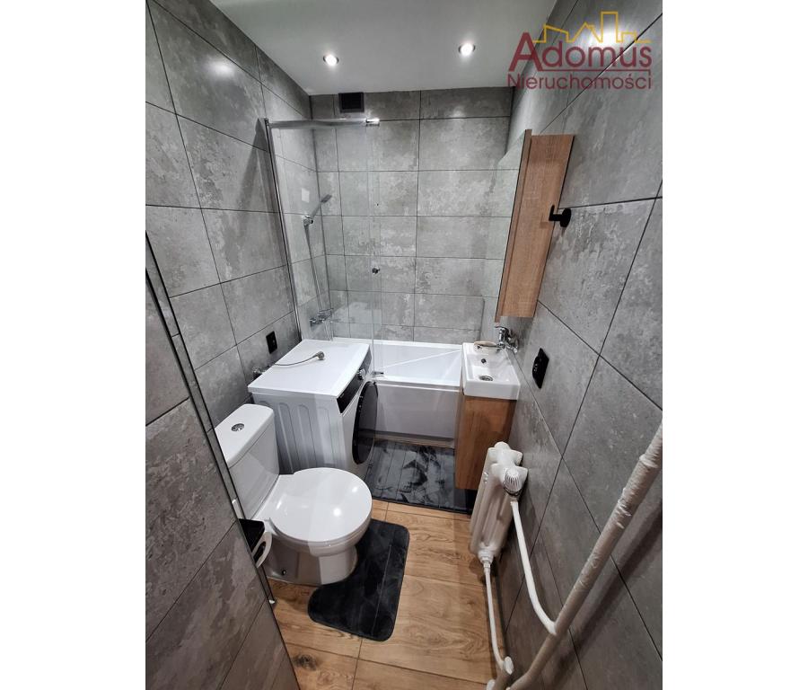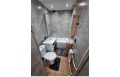 W kuchni meble na wymiar, sprzęt AGD: kuchenka gazowo-elektryczna, okap, lodówka. W łazience wanna z szybą prysznicową, pralka.