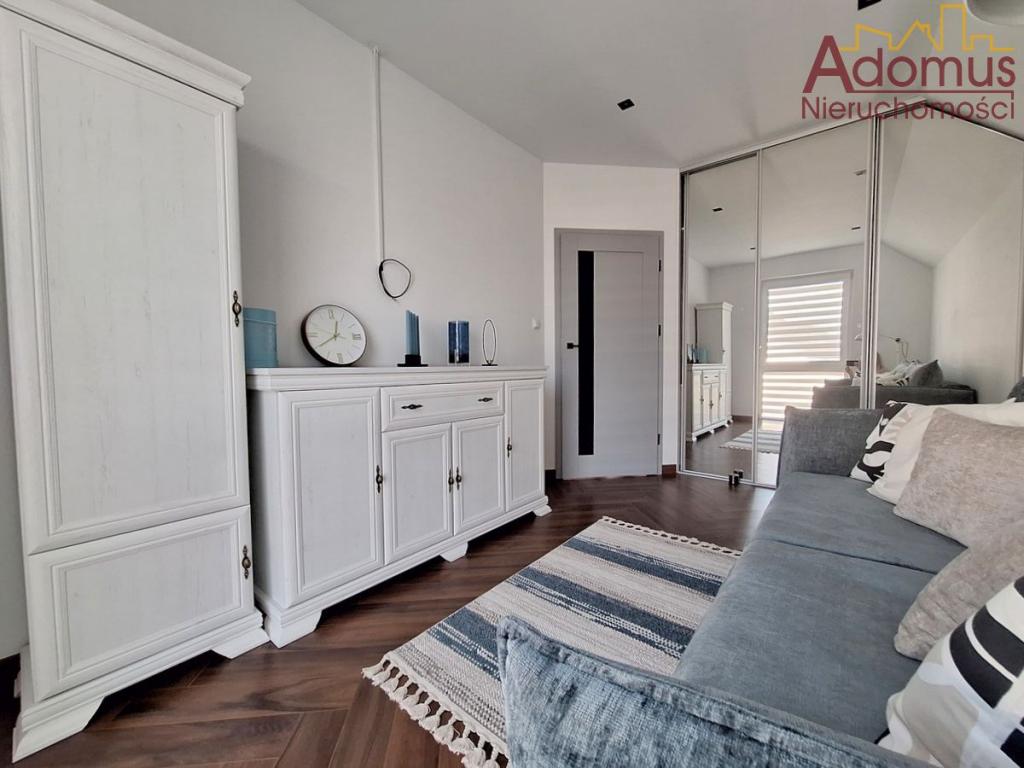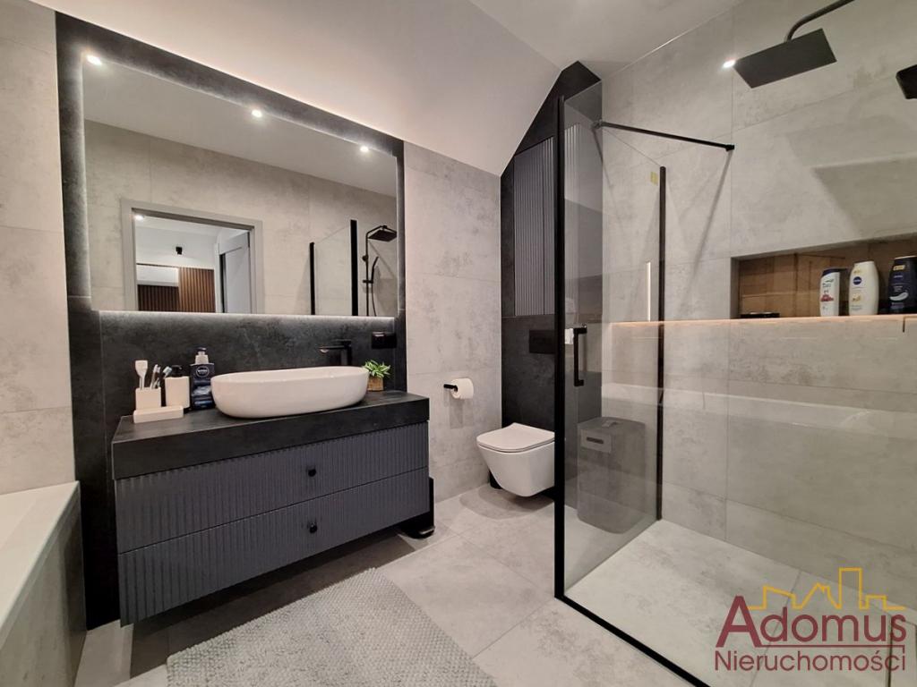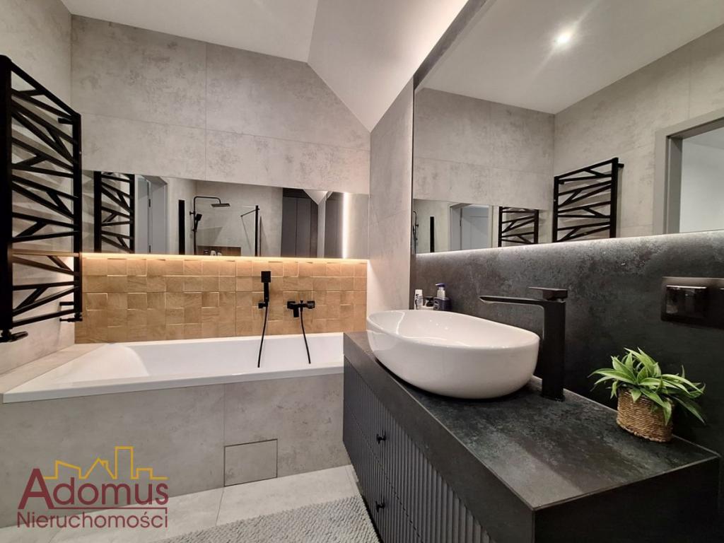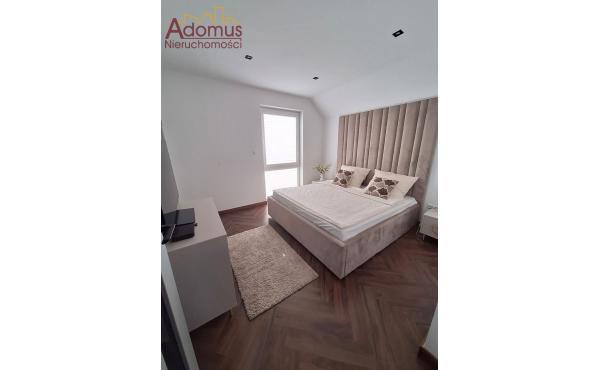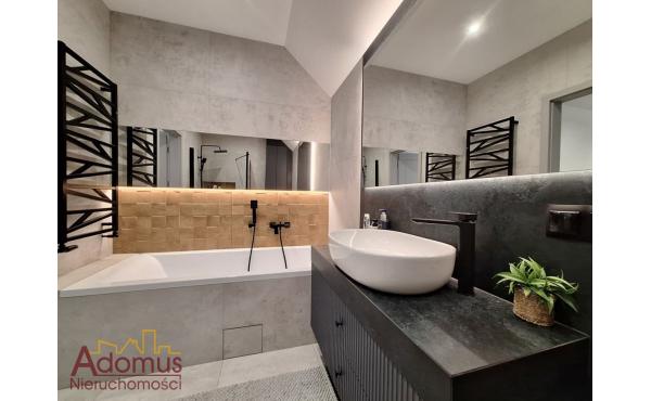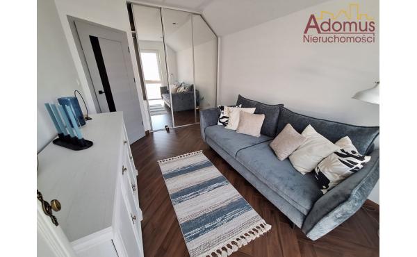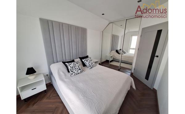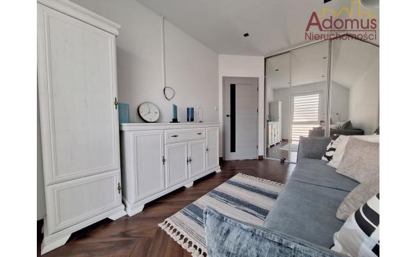 Przestronny salon z częścią jadalną wykończony w spójnej kolorystyce, z nowoczesnym oświetleniem,  nadają wnętrzu ciepła i elegancji. Kuchnia to w pełni wyposażona, autorska zabudowa stolarska wraz ze sprzętem AGD w zabudowie, idealna dla osób, które cenią nowoczesny design. Łazienka zachwyca minimalistyczną formą, oświetlenie i elegancka ceramika tworzą przytulną przestrzeń relaksu. W przedpokoju oraz dwóch sypialniach znajdują się pojemne szafy na wymiar, gwarantujące doskonałą organizację przestrzeni bez utraty estetyki.