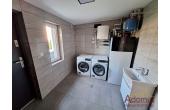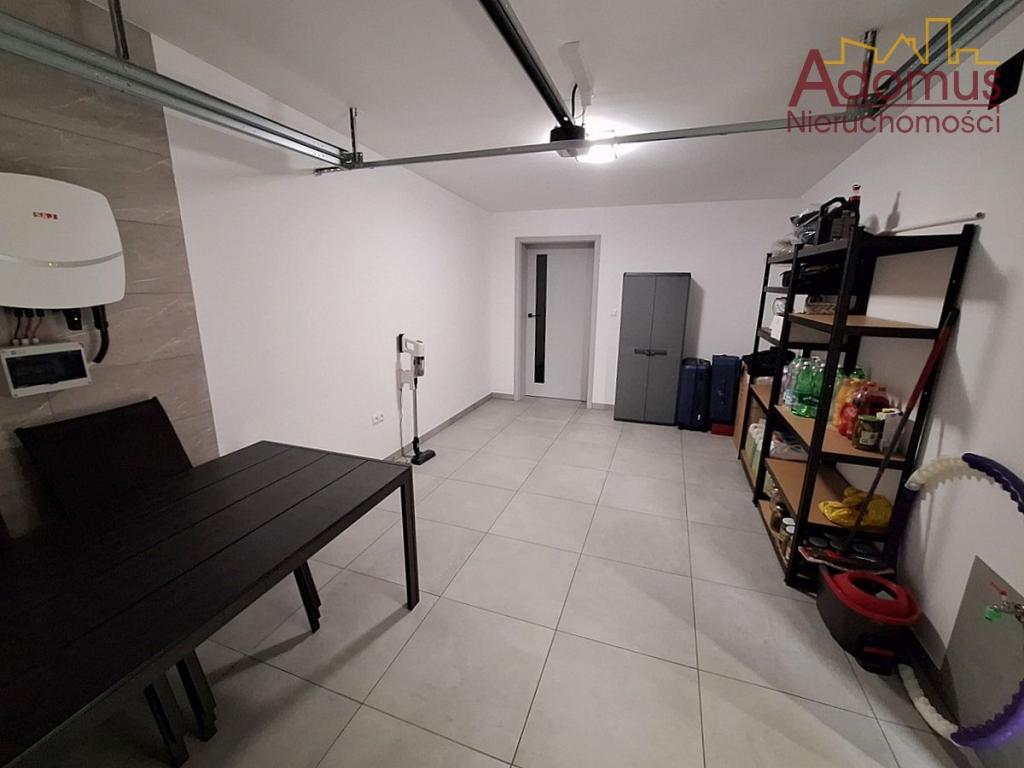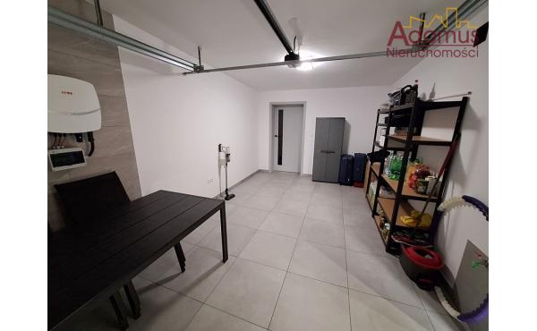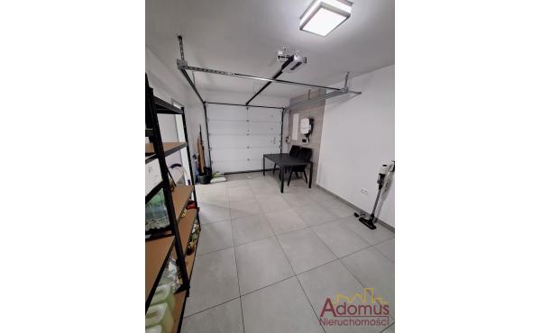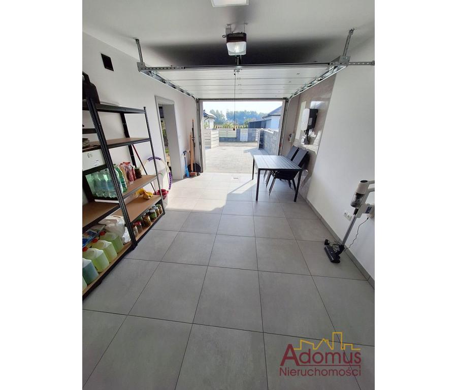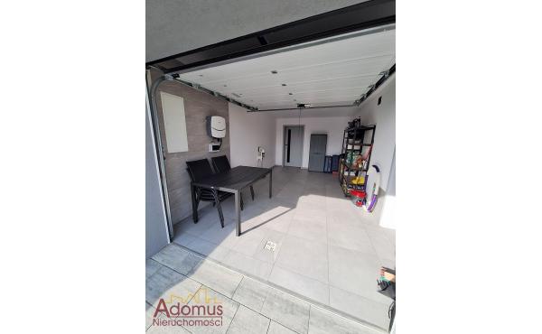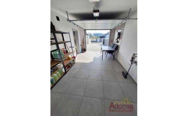 Na parterze znajduje się kuchnia otwarta na jadalnię i przestronny salon z kominkiem, toaleta, wiatrołap, pralnia oraz jednostanowiskowy garaż z automatycznie zamykaną bramą. Z salonu prowadzi wyjście na taras (pow.ok.18,65 m²) oraz zagospodarowany różnorodną roślinnością ogród.