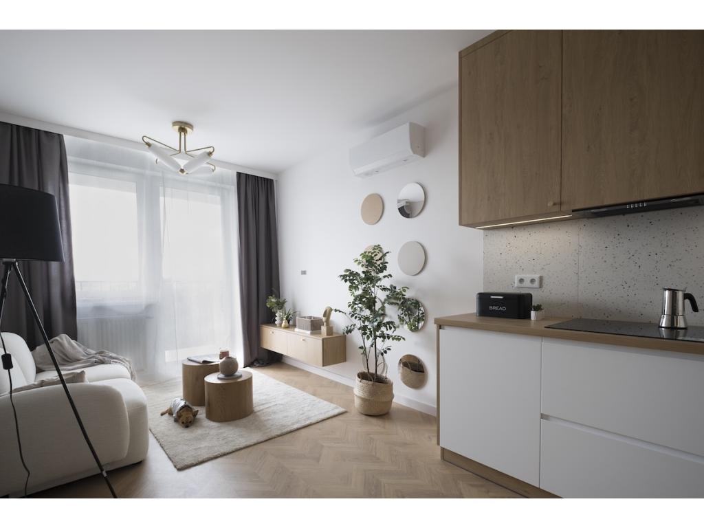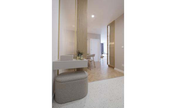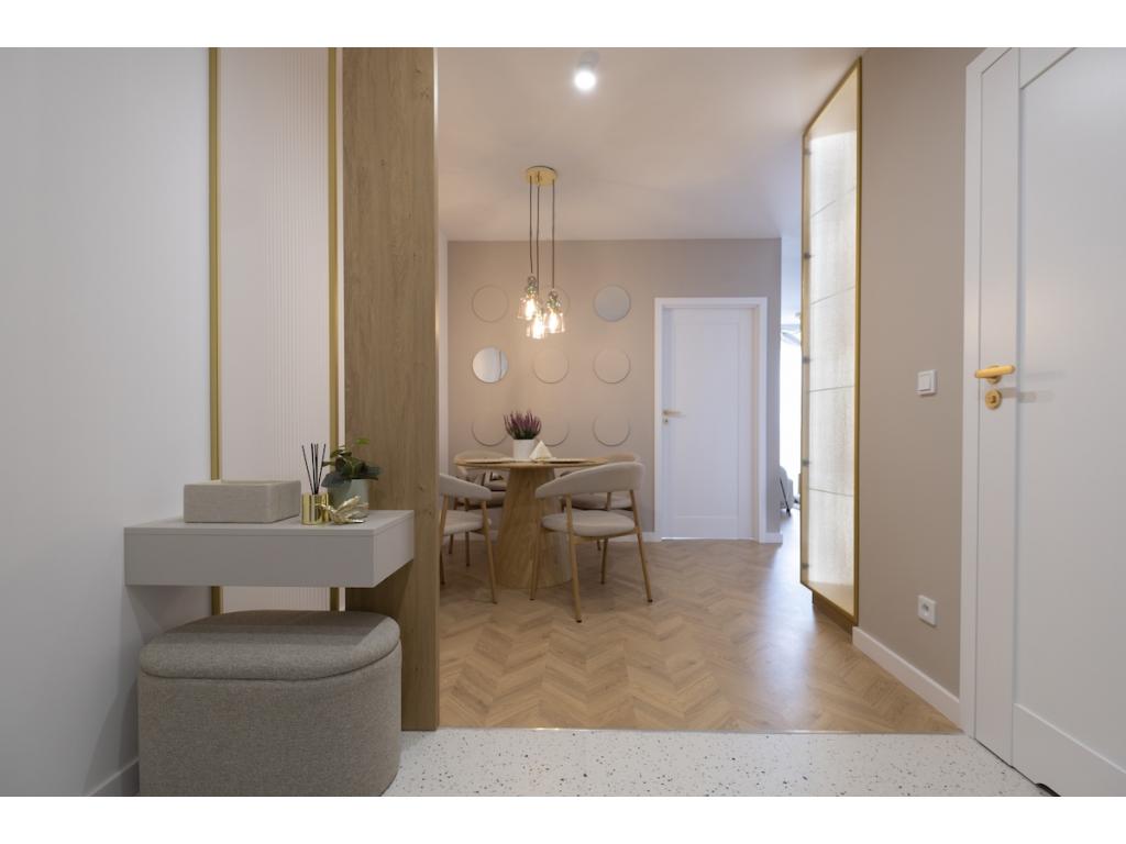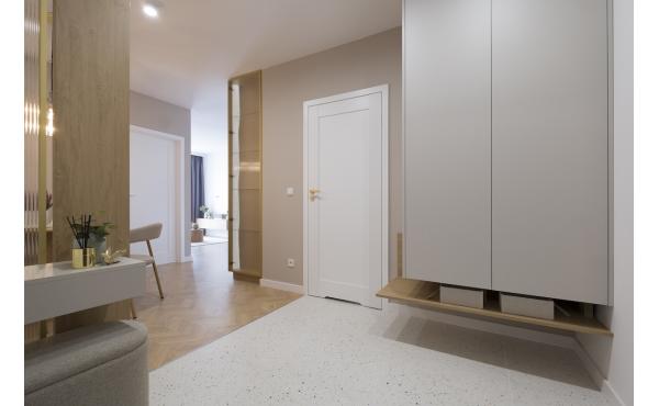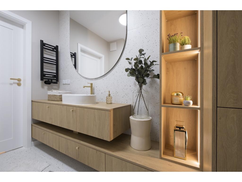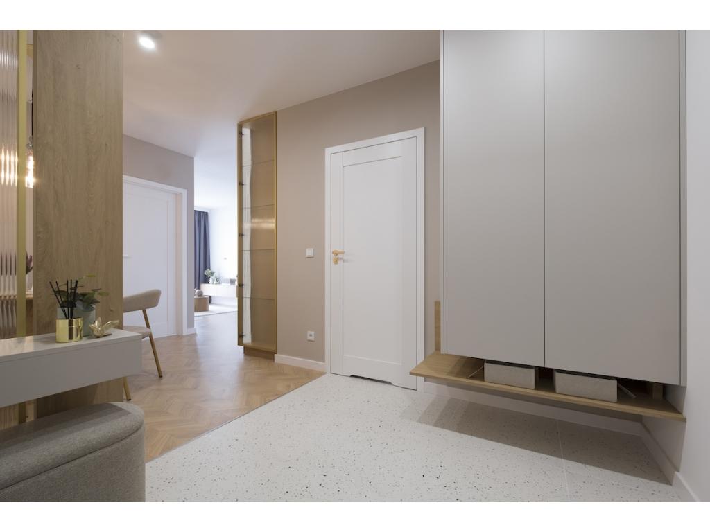Dominują tu ciepłe odcienie beżu, złamanej bieli i naturalnego drewna, przełamane szlachetnym lastryko. W łazience zaprojektowano kabinę prysznicową, pojemną zabudowę i efektowne detale, które tworzą wrażenie spójnej całości. W przedpokoju znajdziemy praktyczną szafę w zabudowie, a komfort codziennego użytkowania podnosi zaistalowana klimatyzacja.