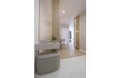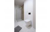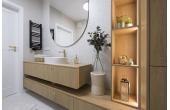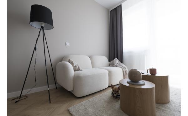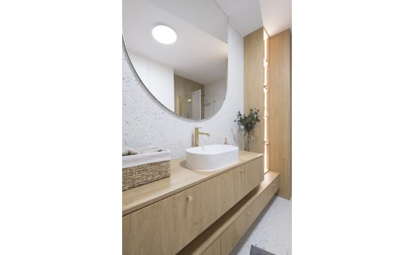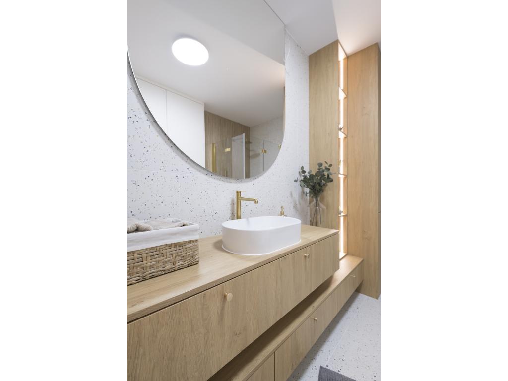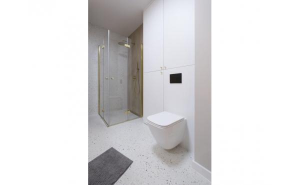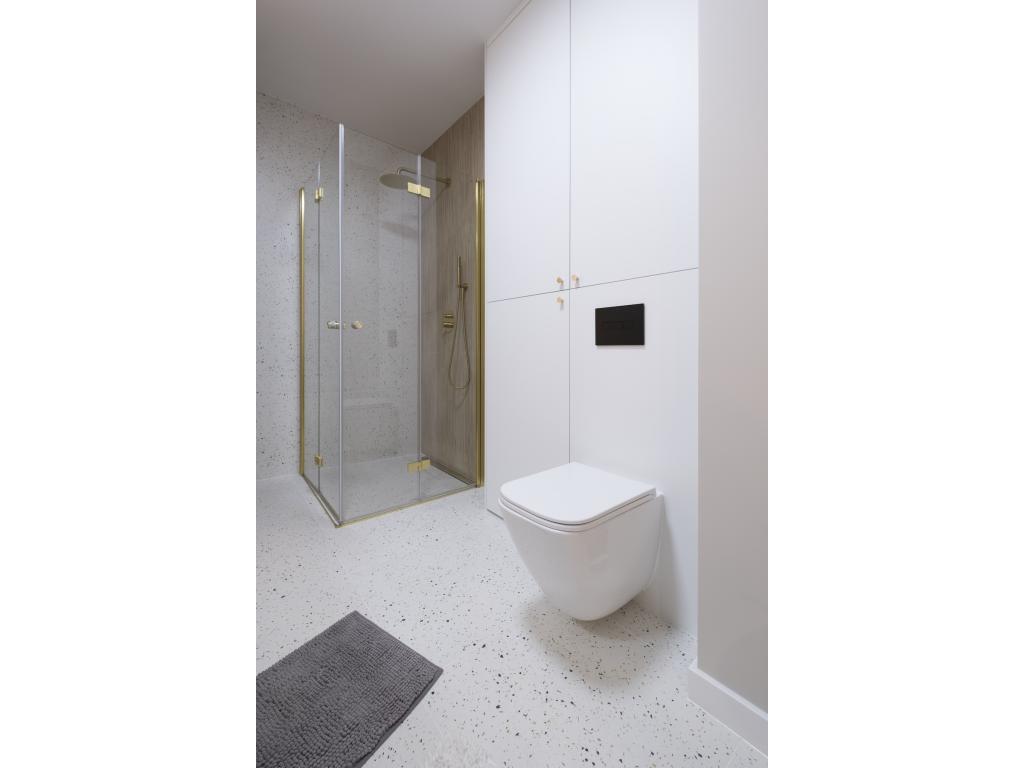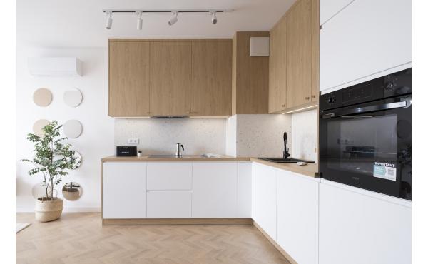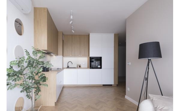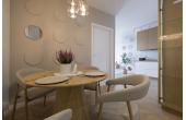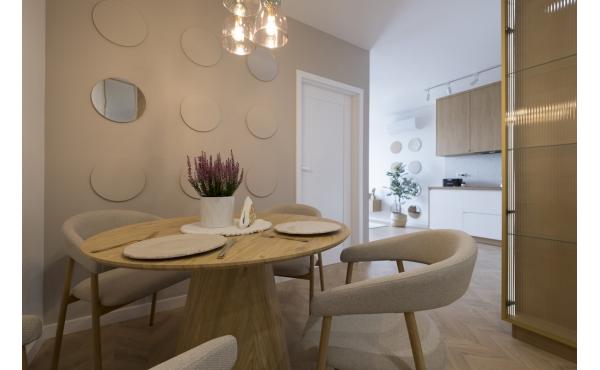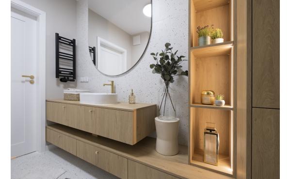 Dominują tu ciepłe odcienie beżu, złamanej bieli i naturalnego drewna, przełamane szlachetnym lastryko. W łazience zaprojektowano kabinę prysznicową, pojemną zabudowę i efektowne detale, które tworzą wrażenie spójnej całości. W przedpokoju znajdziemy praktyczną szafę w zabudowie, a komfort codziennego użytkowania podnosi zaistalowana klimatyzacja.