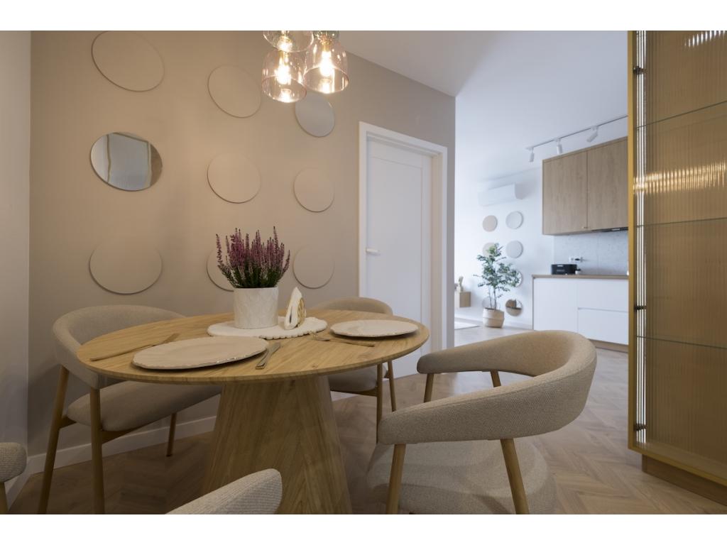 Nieruchomość znajduje się na czwartym piętrze nowego budynku z windą. Już od progu widać staranność projektu – harmonia proporcji, spójność materiałów i subtelne detale tworzą wnętrze, które łączy nowoczesność z przytulnością.