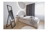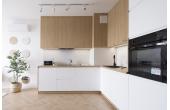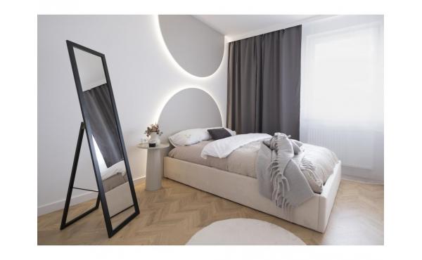 Kuchnia oraz zabudowy meblowe zostały wykonane na indywidualne zamówienie przez stolarza, dzięki czemu wnętrze zyskało niepowtarzalny charakter. Sypialnia zachwyca subtelnym oświetleniem LED w formie dekoracyjnych łuków, które podkreślają elegancję i wprowadzają wyjątkowy nastrój.